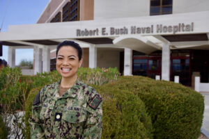 Cmdr. (select) Jasette Marian M. Fong, Pediatric Clinical Nurse Specialist and newly appointed Pediatric Advanced Life Support Program Director at Naval Hospital Twentynine Palms, poses for a photo in front of Robert E. Busch Memorial Hospital at Marine Corps Air Ground Combat Center, Twentynine Palms, Calif., Jan. 11, 2026. Fong brings more than 16 years of Navy experience to the role and will oversee the hospital’s Pediatric Advanced Life Support program to strengthen pediatric emergency readiness and training. (U.S. Navy photo by Christopher C. Jones, NHTP/NMRTC Twentynine Palms public affairs officer).